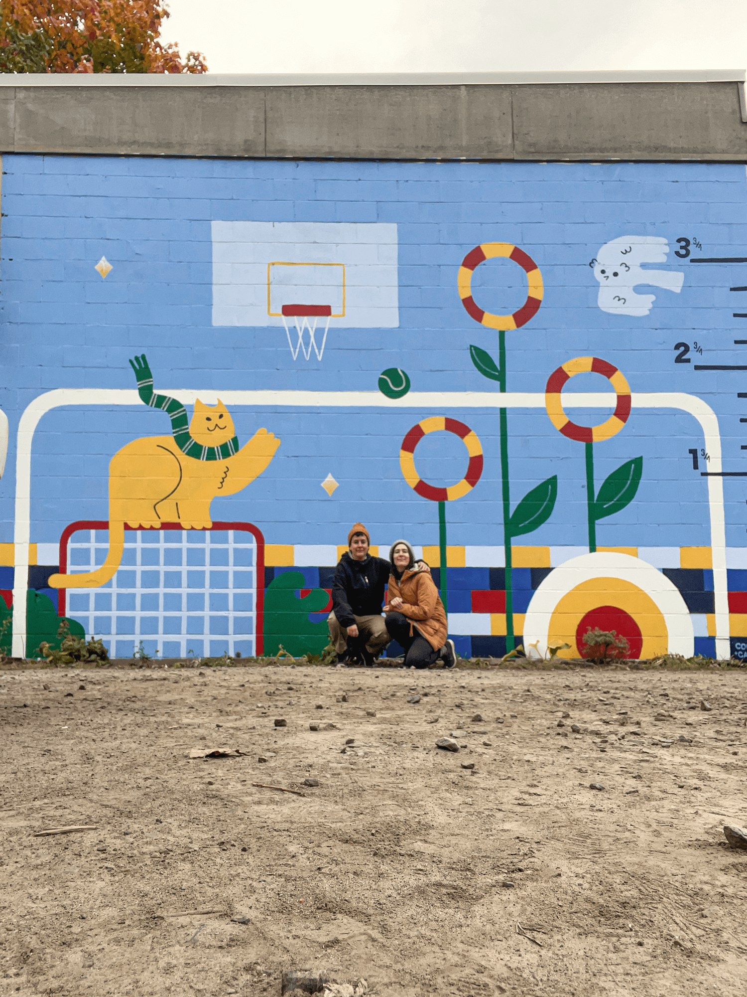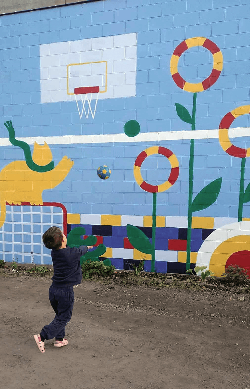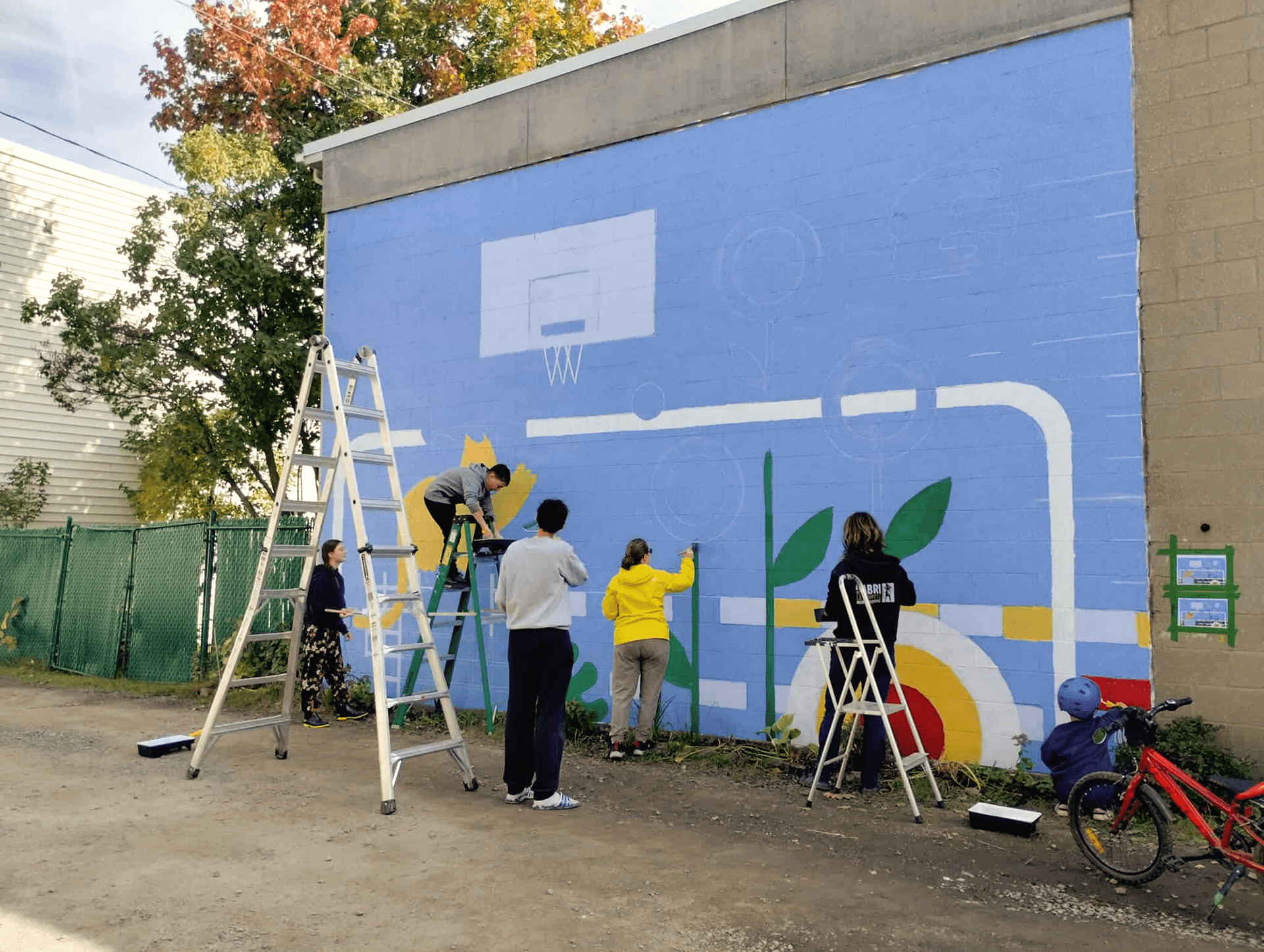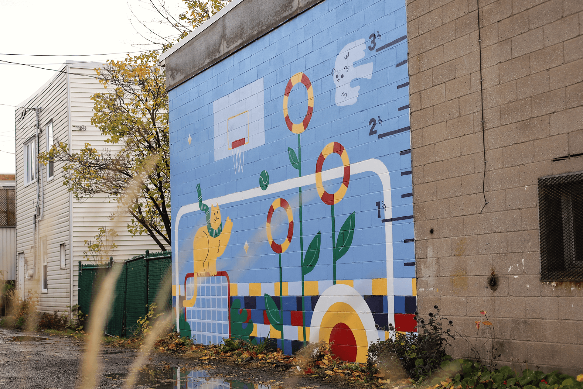 Réalisée dans le cadre d’un programme de ruelles vertes et actives soutenu par Nature Québec, cette intervention visait à transformer un espace de passage en lieu de rencontre, de circulation et de fierté collective. L’œuvre, destinée aux familles locales, est pensée autour de l'activité et conçue pour que l’appropriation citoyenne émerge avec un cadre artistique est clair, accueillant et structuré. Un cadre ou l'artiste n'est plus au centre, mais aux côtés des citoyens. En concrétisant la vision du comité et en intervenant aux moments clefs, le projet a permis à la communauté d’être actrice de la réalisation.
